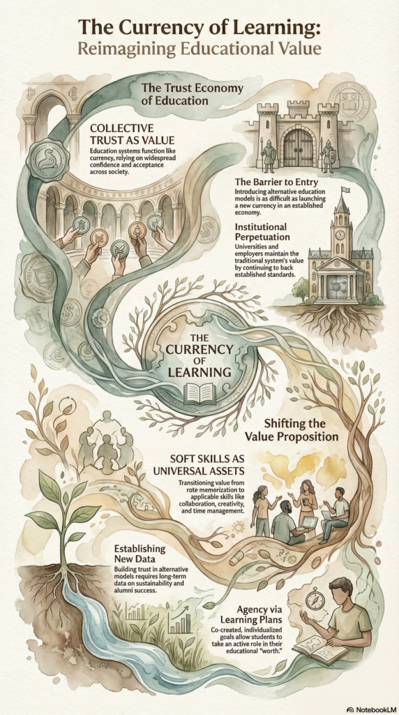 While watching the documentary and listening to class discussion, I’ve been comparing education to currency. From my understanding, modern currency systems are based on collective trust in the value of a particular token or symbol. This collective trust isn’t easy to establish because it requires a significant amount of confidence and acceptance across a large group of people. Education works similarly in that there is long established collective trust in the current system. Regardless of how intrinsically valuable the actual education is for its students, post-secondary institutions and employers continue to perpetuate a certain value for this education system. Therefore, similar to how hard it is to introduce a brand new currency into an already-established economy, it’s extremely difficult for alternative education models to gain traction when the majority of universities and employers are still backing the traditional system.