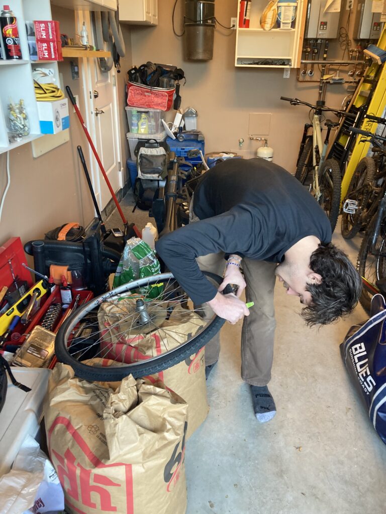 I wheel my bike over to Evan’s along with my new tubes, tire pump, and some fresh baked biscotti as an expression of my gratitude. Evan did a great job of going step by step through the process of replacing the tubes.